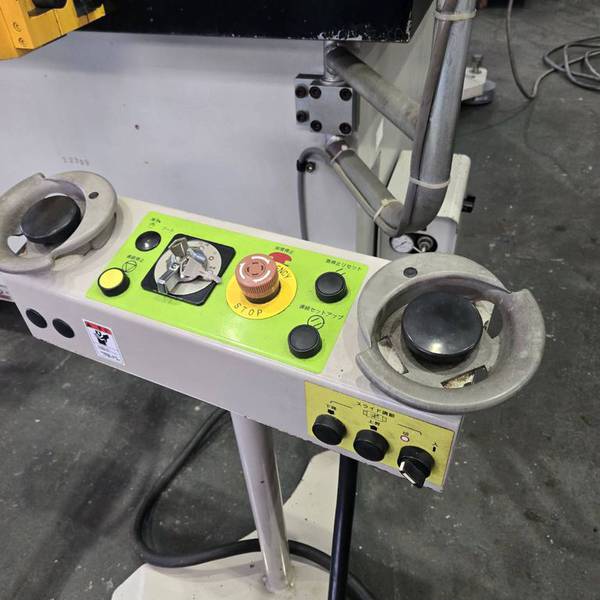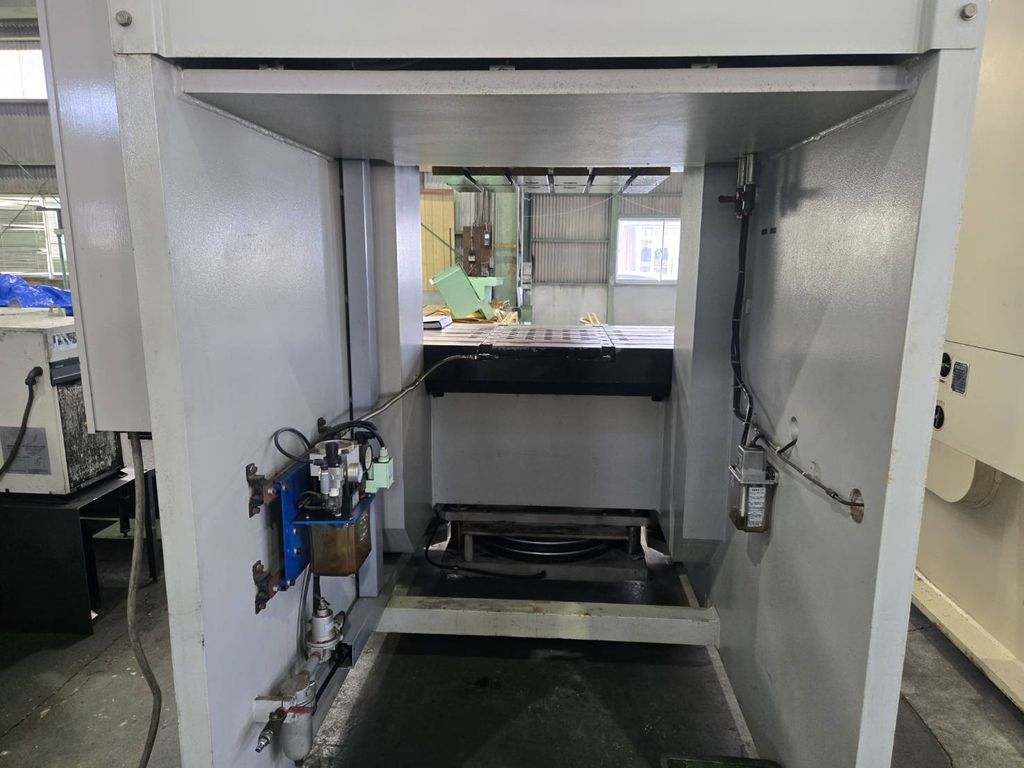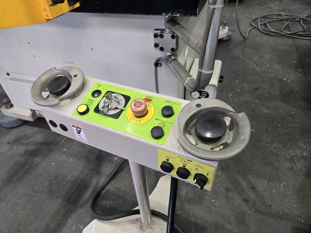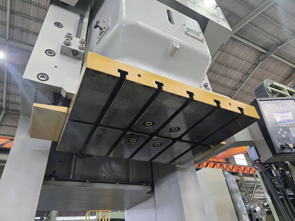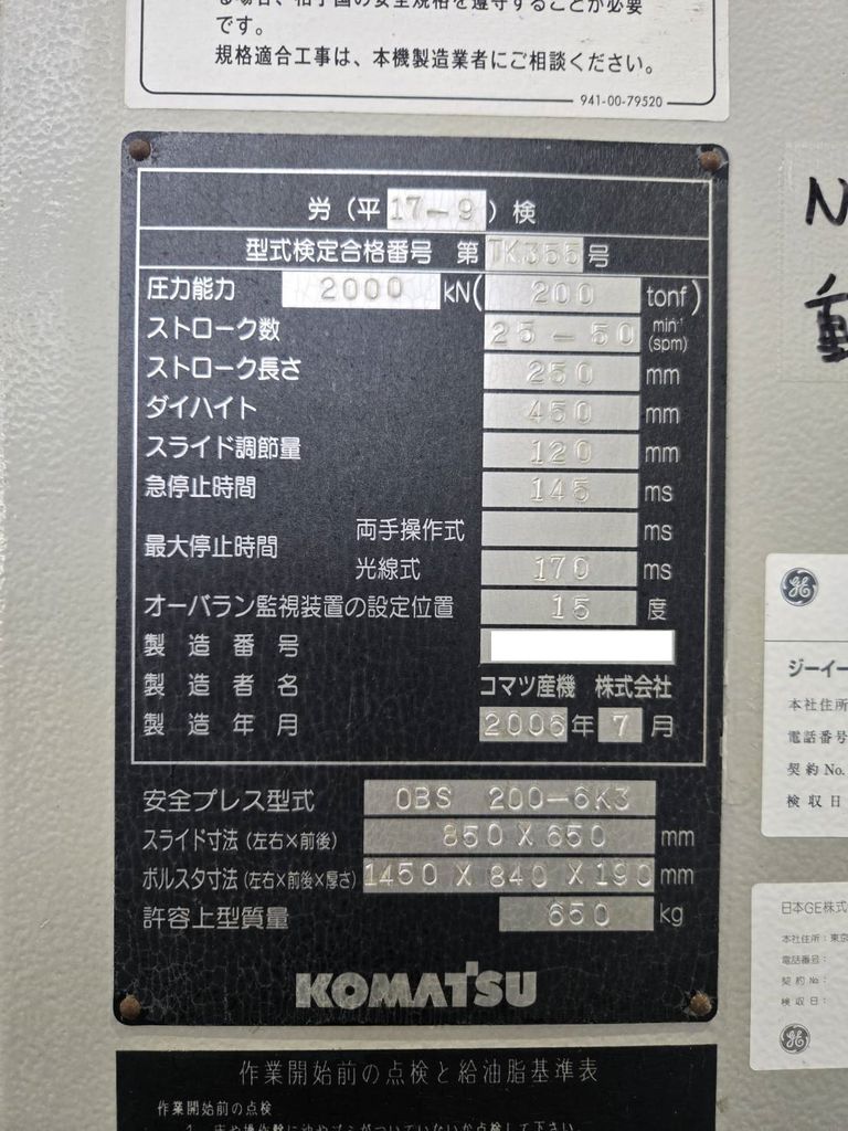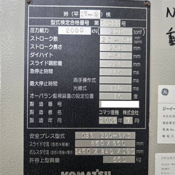 ◆압력 능력:2000kN(200tonf) ◆스트로크수:25-50min-1 ◆스트로크 길이:250 mm ◆다이 하이트:450 mm ◆슬라이드 조절량:120 mm ◆급정지 시간:145ms ◆최대 정지 시간 광선식:170ms ◆오버런 감시 장치의 설정 위치:15° ◆슬라이드 치수(좌우×전후):850×650 mm ◆볼타 치수(좌우×전후×두께):1450×840×190mm ◆허용 상형 질량:650kg